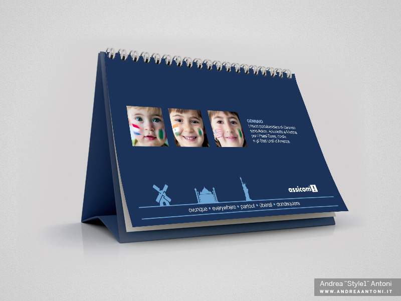 Dato il tema “ovunque • everywhere • partout • überall • dondequiera“, su mani e volti dei piccoli protagonisti sono state disegnate delle bandiere di diverse nazioni: lo si nota meglio nella pagina “retro” del mese nella quale sono presenti i primi piani dei bambini e delle illustrazioni che vanno a ribadire la nazione di cui si parla.