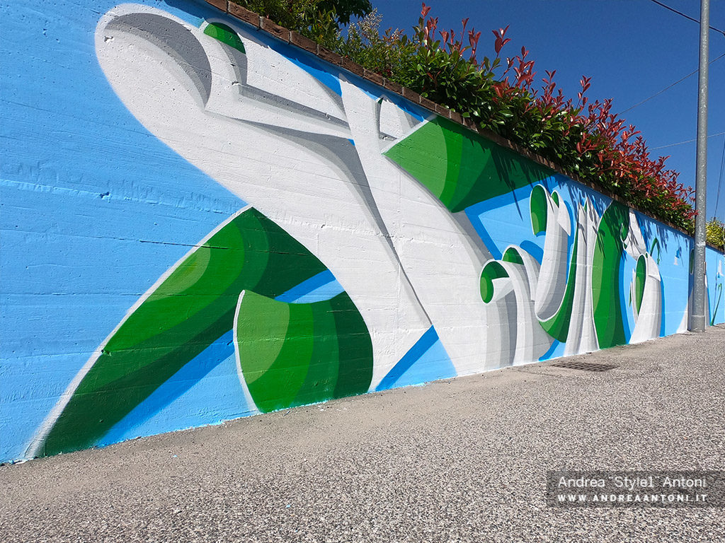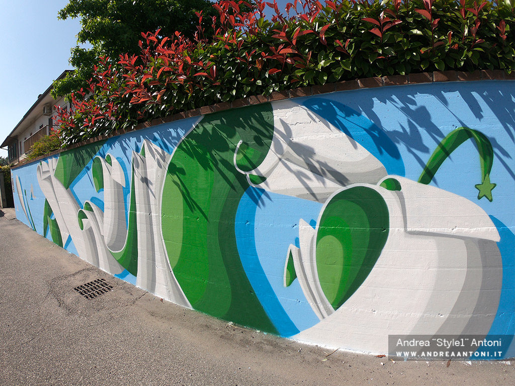 Il graffito è uno dei miei “classici” lettering, colorato a fasce di tinte piatte a scala di colore in modo tale da conferire volume e profondità ai nastri.