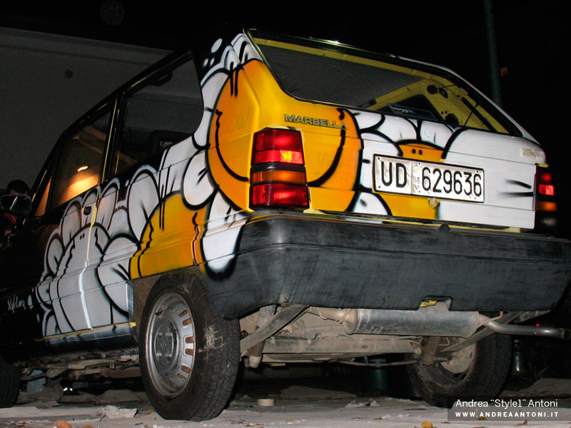 Dopo la preliminare copertura di tutte le parti che non dovevano essere intaccate dalla vernice spray, l’autovettura è stata dipinta sul cofano da Sly, con una delle due famose “Vegetazioni Irreali“, mentre su parte delle fiancate e sul posteriore è stata dipinta da me con alcuni fiorellini sorridenti, tipici della mia linea Be Happy Project.