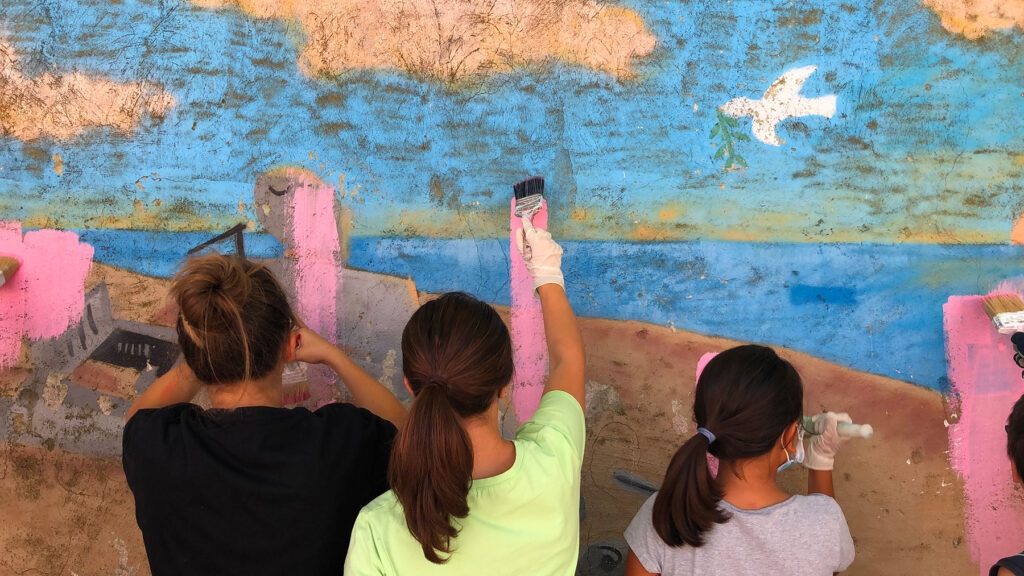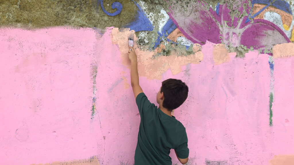 Imbiancamento della parete da parte dei ragazzi, utilizzando tempere rulli e pennerlli.