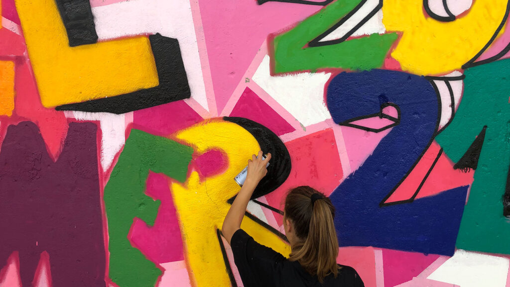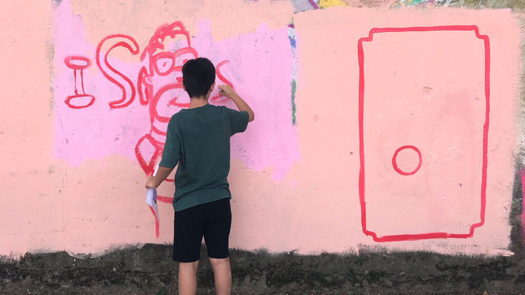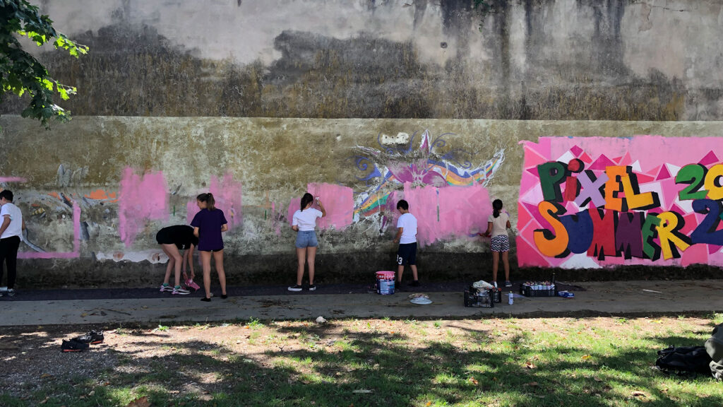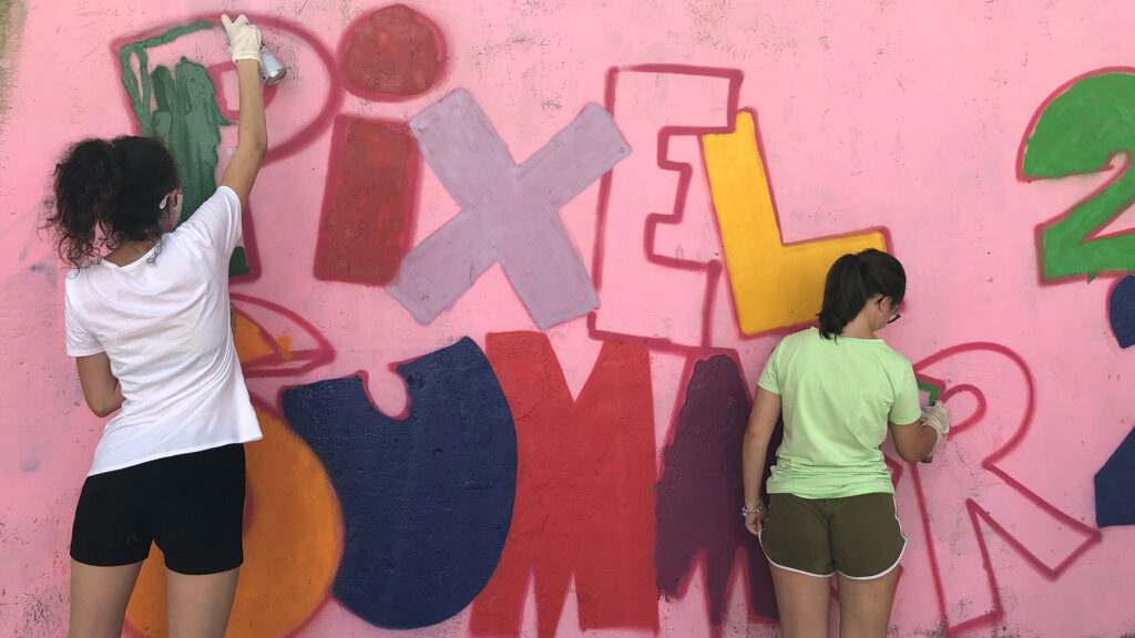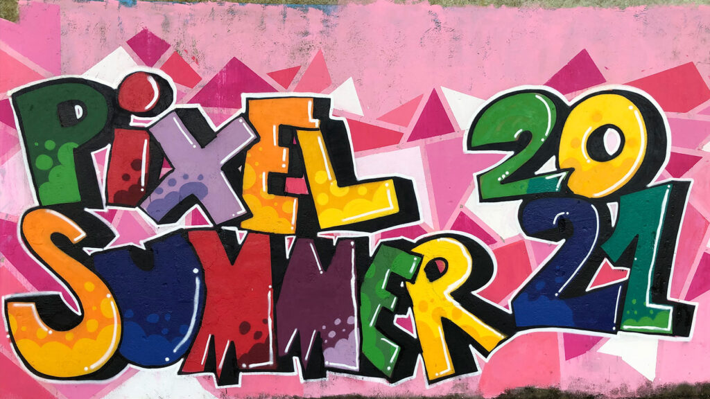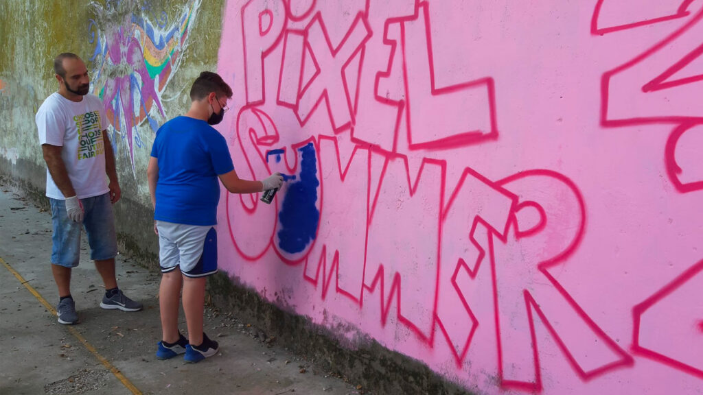 Realizzazione di un opera con scritto “Pixel Summer 2021” per avere un tema comune semplice, lettere tracciate      da me per spiegare e mostrare l’utilizzo delle bombolette mentre la successiva colorazione è stata opera totale dei ragazzi. I ritocchi finali (contorni e colpi di luce) sono stati realizzati da me solo per concludere il graffito togliendo errori grossolani e realizzando dei tratti che, per dei “novizi” risultano particolarmente complessi.