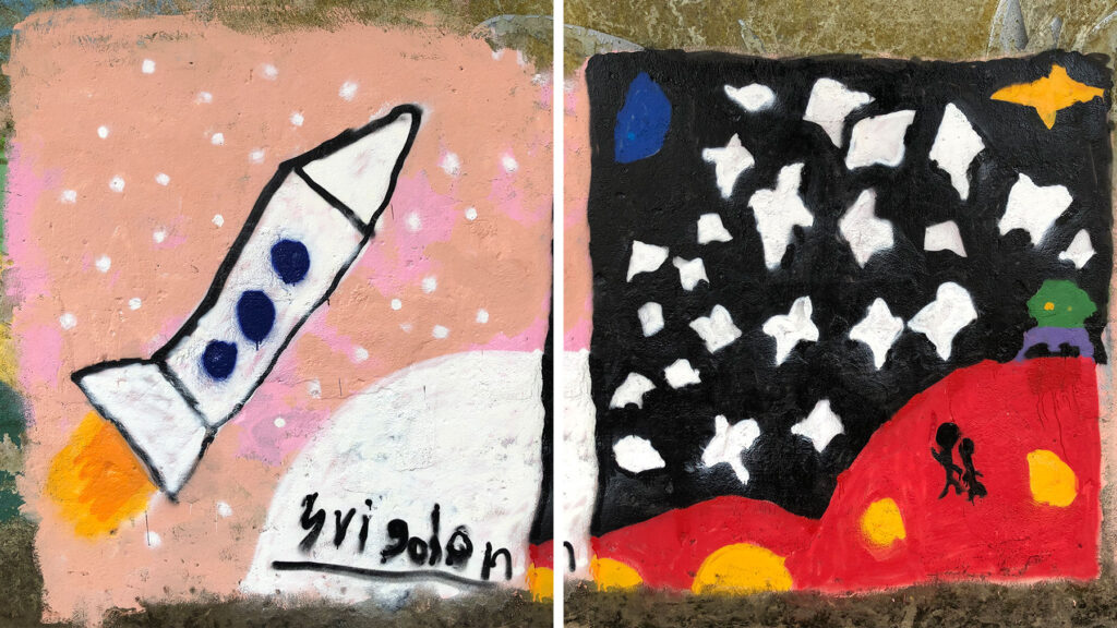 Quindi hanno provveduto ad imbiancarsi lo spazio di parete necessario, hanno tracciato il disegno che precedentemente avevano scelto e realizzato in bozza su carta, e lo hanno colorato e ritoccato.